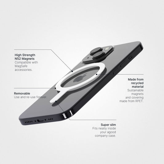 Each ring is magnetic, reusable, and built to outlive your phone. Just a precise, circular design made to work seamlessly with our clear, compostable phone cases - and any MagSafe-compatible iPhone.
