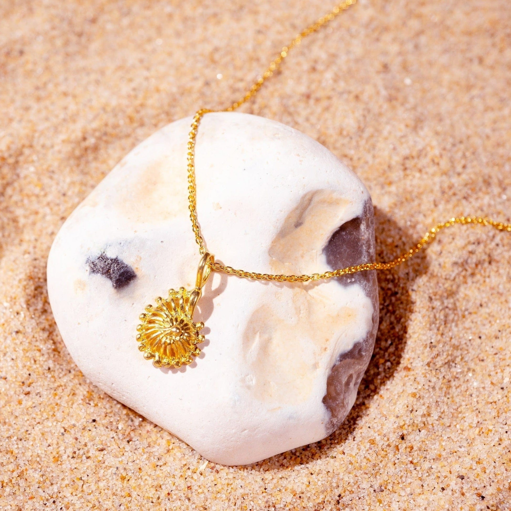 The ammonite charms were designed and sculpted in a 3D printing style and can be hung from an 18" inch or 20" inch chain. Available in Gold and Silver.