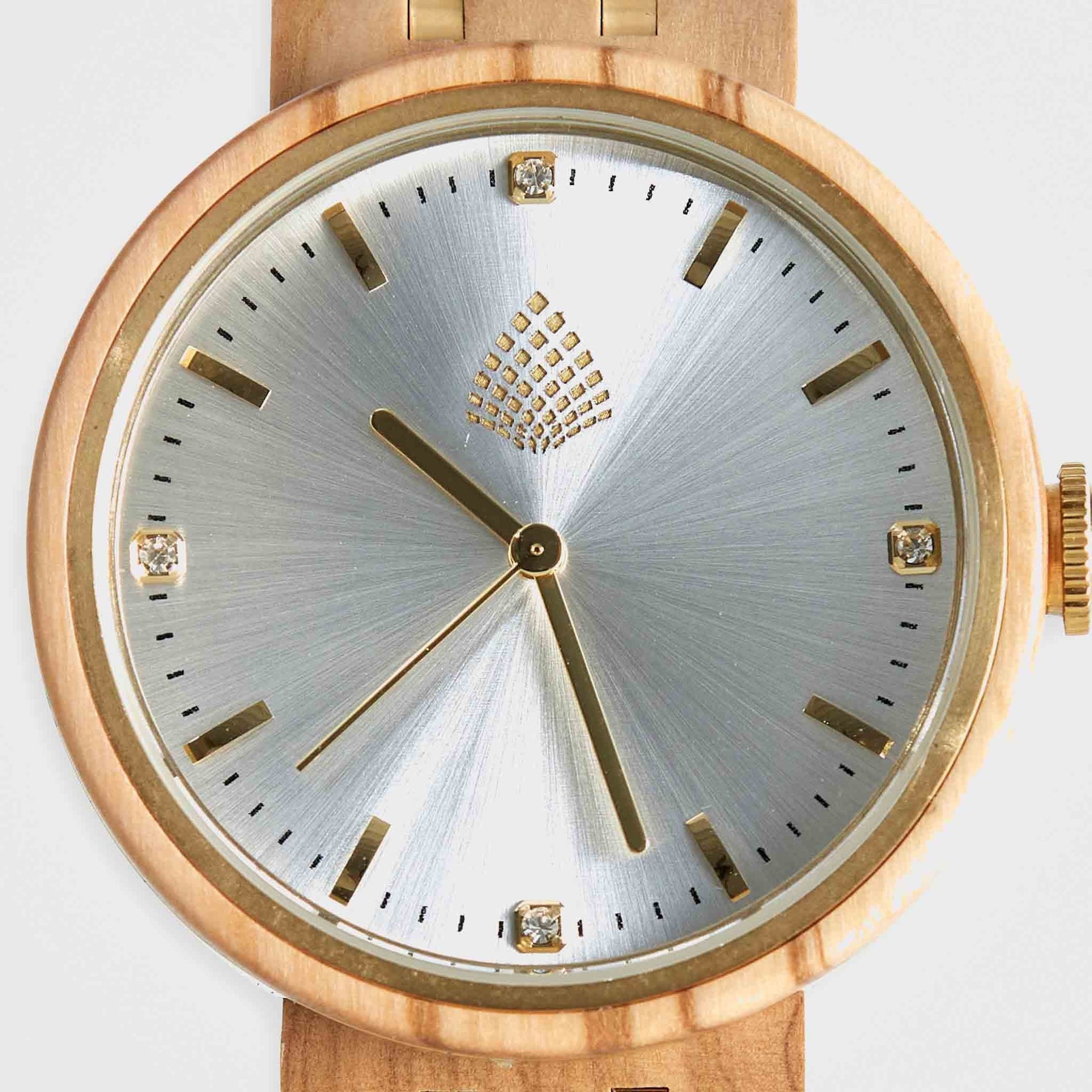 Crafted from recycled olive wood, this sustainable watch combines versatile style with everyday usability, accented by gold metal links on the strap. Made by: The Sustainable Watch Company.